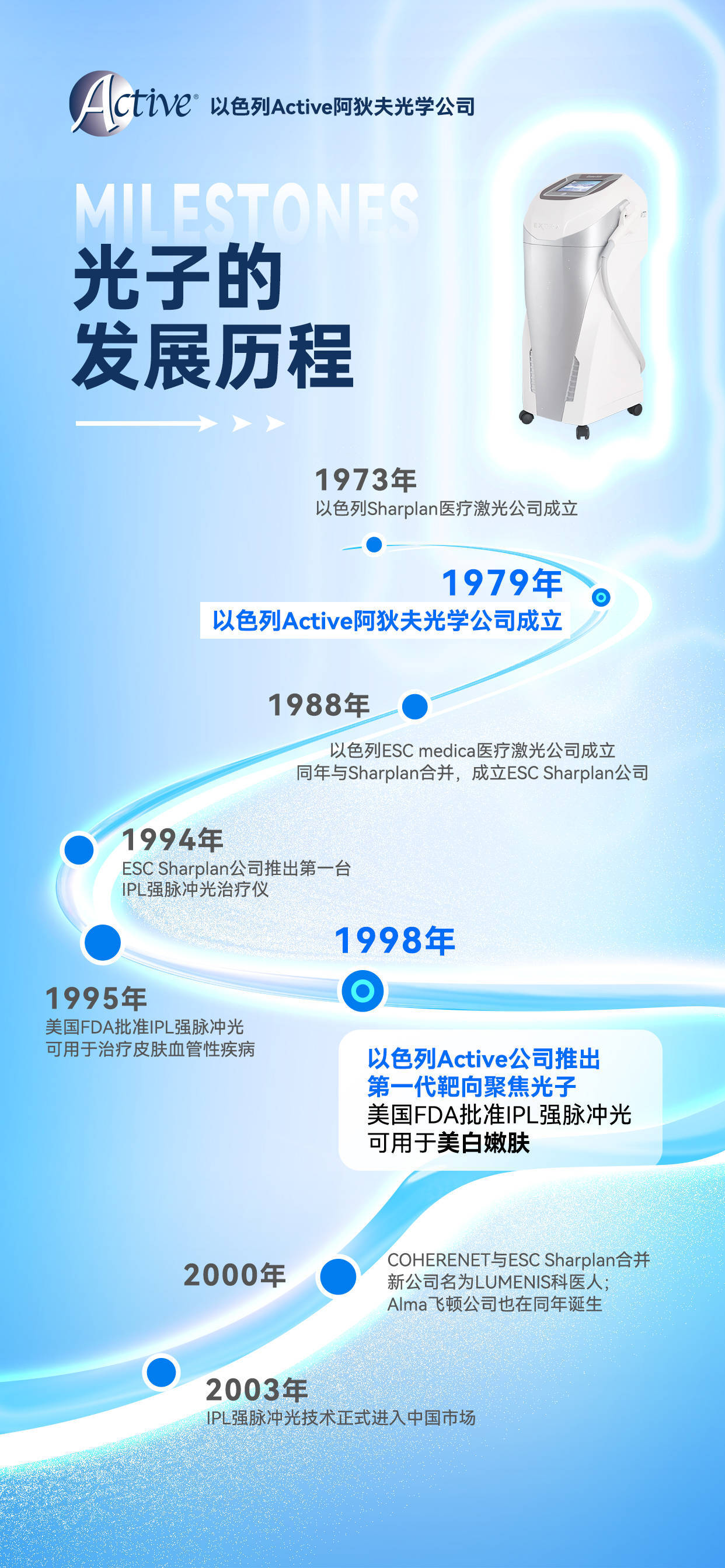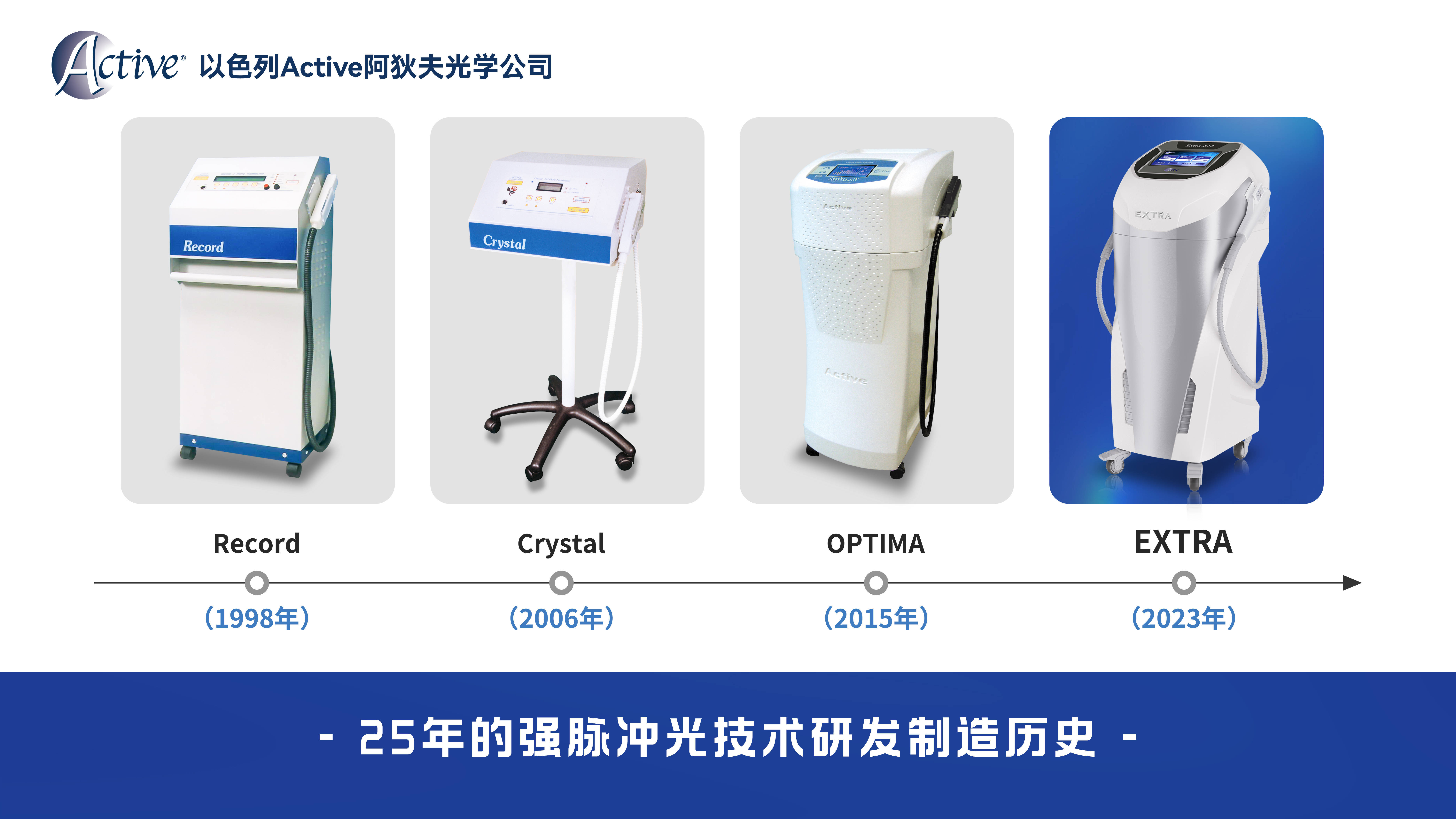 以色列Active公司成立于 1979 年,拥有 45 年的品牌历史和25年的强脉冲光技术研发制造经验。以色列是强脉冲光技术的发源地,Active公司早在1998 年就开始专注于强脉冲光技术,是世界上最早进入该领域的公司之一。至今公司旗下明星产品EXTRA非凡蛋白光畅销全球几十个国家和地区,获得了 22个国家的权威认证。